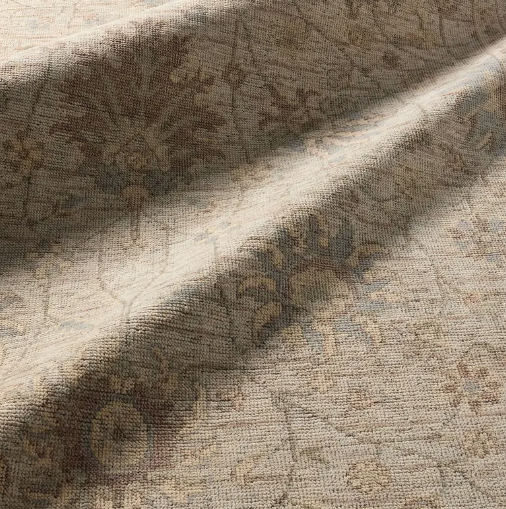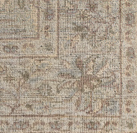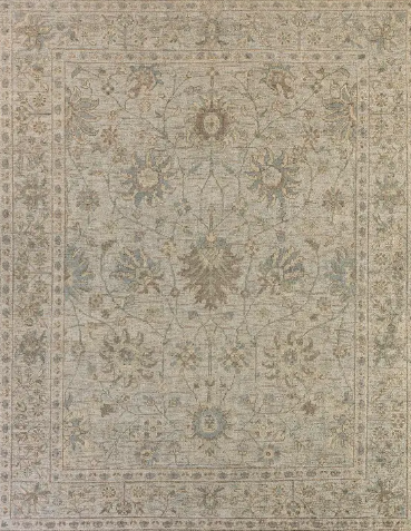 Heirloom-quality designs of stunningly abrashed Old World patterns. Boasts a beautifully washed floral motif with a decorative border. The green tones are accented with tan and gray hues for added depth and intrigue. This durable wool handknot anchors living spaces with a fresh take on vintage style.