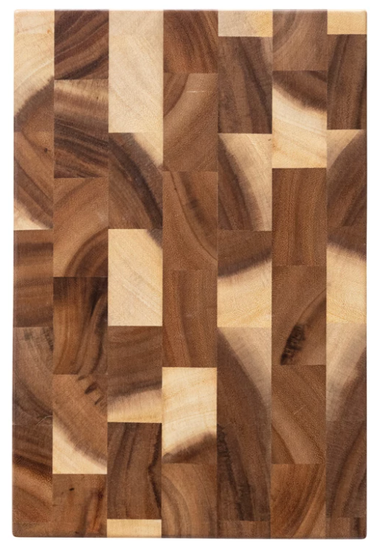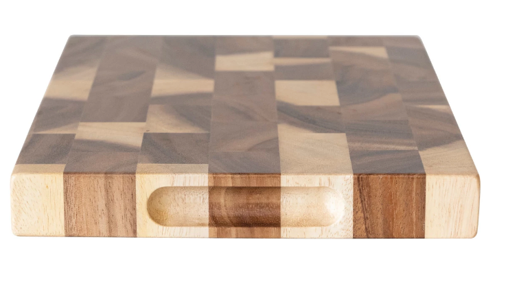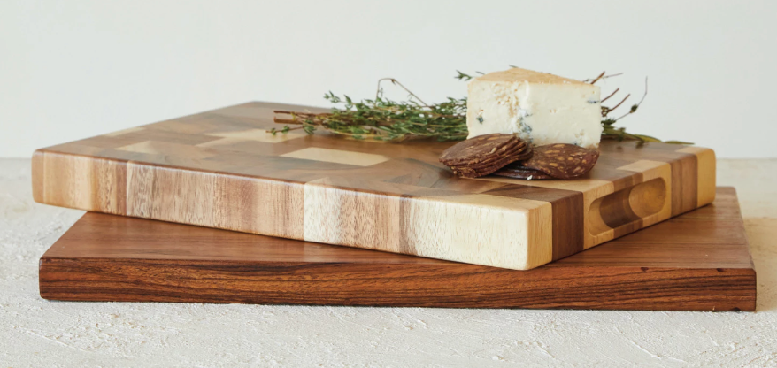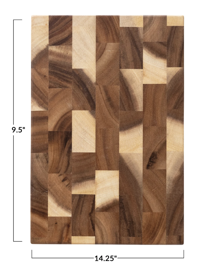 This natural suar wood end grain cheese/cutting board is a durable and stylish addition to any kitchen or dining room. Made from tropical suar wood, it features a unique grain pattern, strength, and stability. The end-grain design makes it resistant to cuts and scratches, while the smooth surface is easy to clean and maintain. Ideal for slicing, chopping, and serving a variety of foods, this board adds warmth and natural beauty to any occasion.